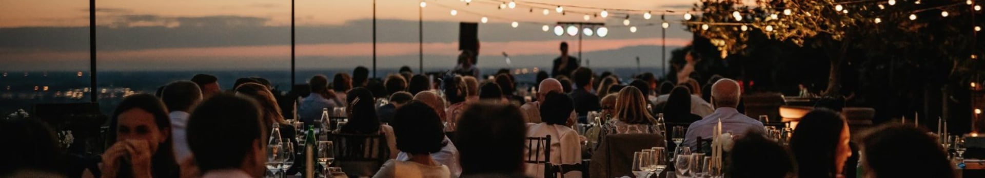 Dinner and dancing begin at 6 PM in the beautifully lit garden.